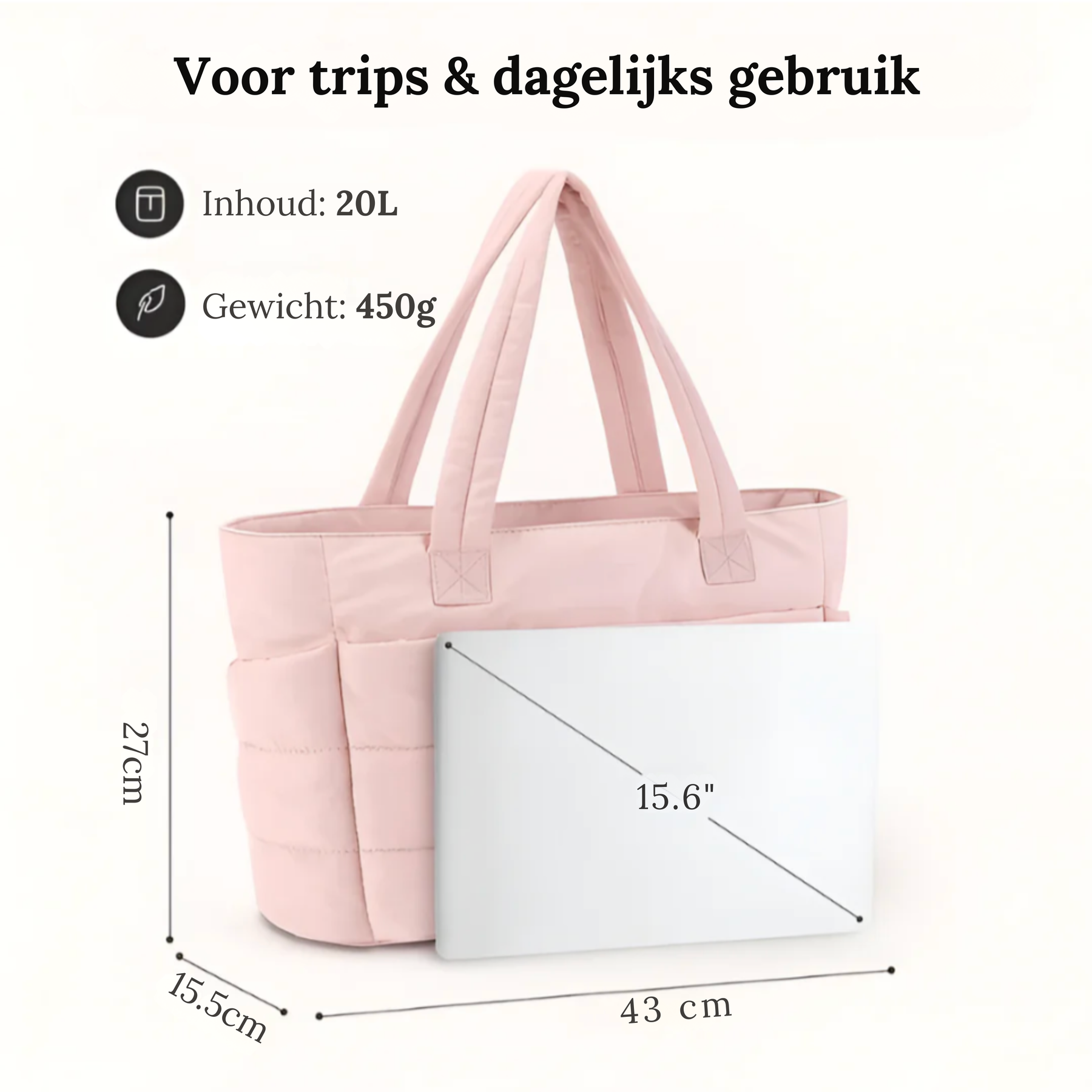 Deze tas voelt verrassend licht aan, ook wanneer hij goed gevuld is. Je draagt moeiteloos je laptop, essentials en extra’s zonder zwaar gevoel op je schouder.